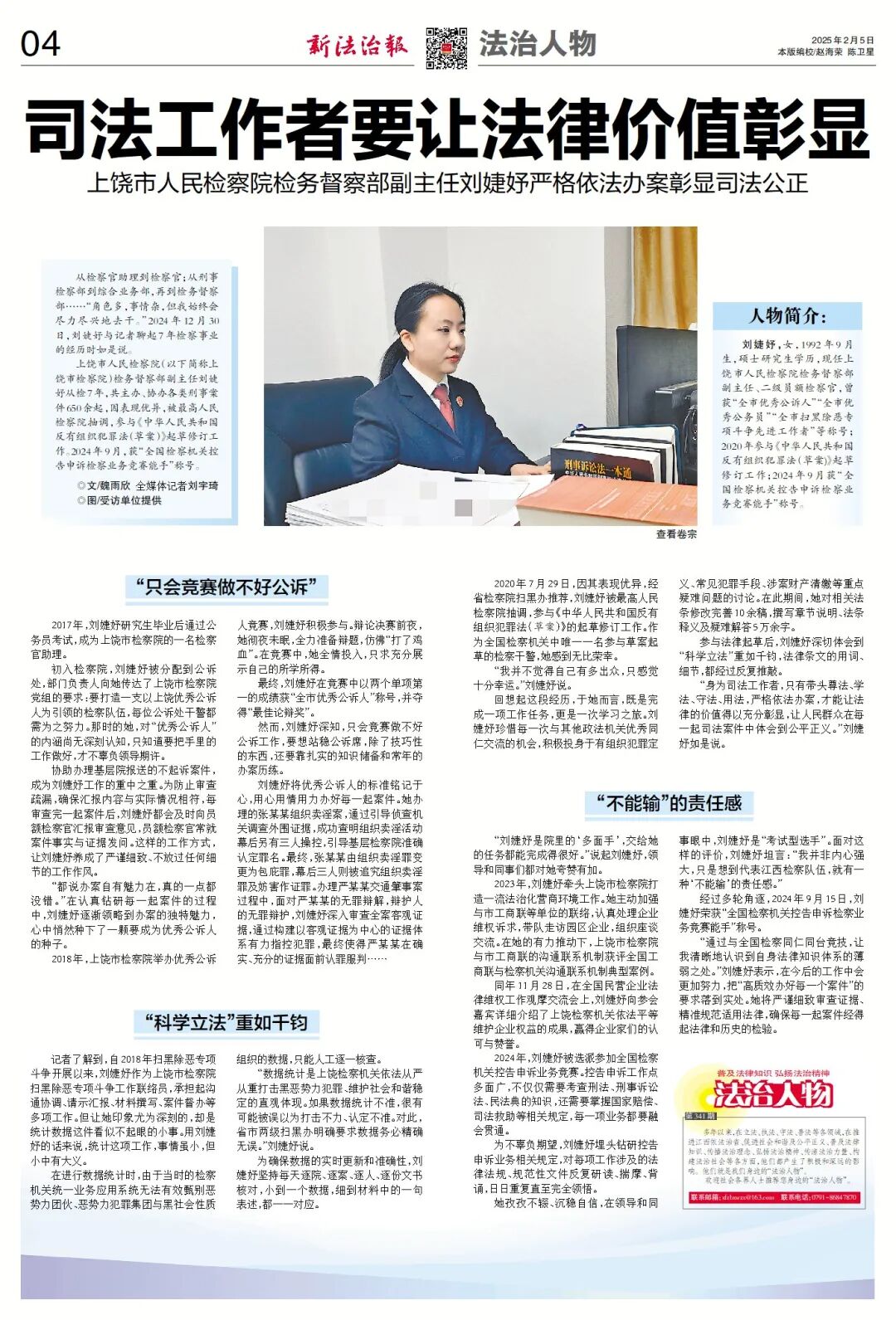 上饶市人民检察院(以下简称上饶市检察院)检务督察部副主任刘婕妤从检7年,共主办、协办各类刑事案件650余起,因表现优异,被最高人民检察院抽调,参与《中华人民共和国反有组织犯罪法(草案)》起草修订工作。2024年9月,获“全国检察机关控告申诉检察业务竞赛能手”称号。