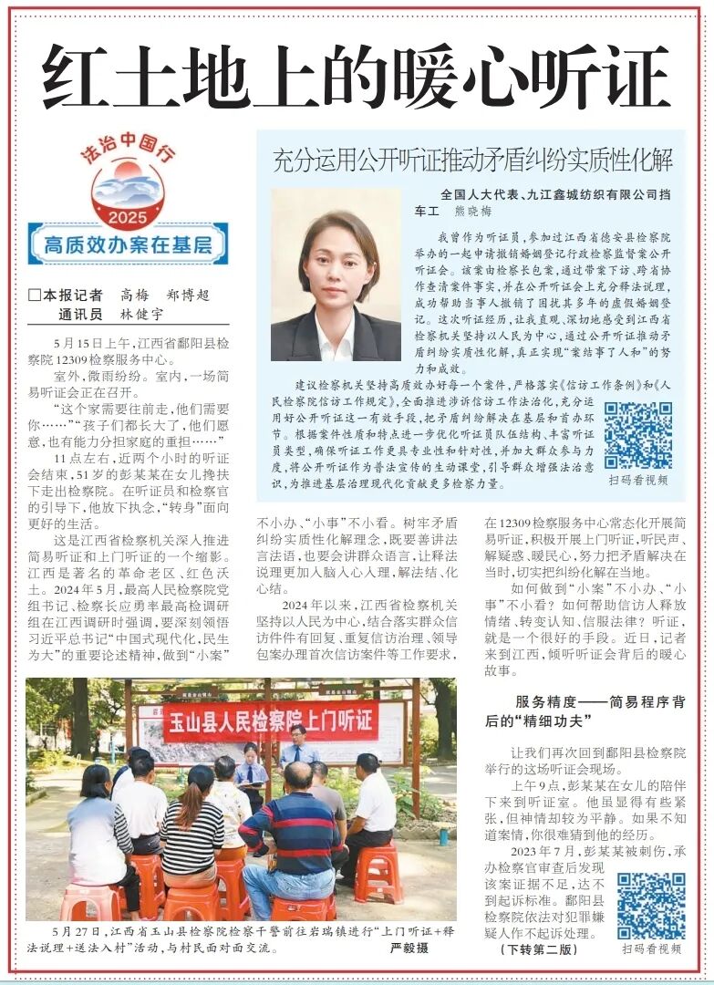 这是江西省检察机关深入推进简易听证和上门听证的一个缩影。江西是著名的革命老区、红色沃土。2024年5月,最高人民检察院党组书记、检察长应勇率最高检调研组在江西调研时强调,要深刻领悟习近平总书记“中国式现代化,民生为大”的重要论述精神,做到“小案”不小办、“小事”不小看。树牢矛盾纠纷实质性化解理念,既要善讲法言法语,也要会讲群众语言,让释法说理更加入脑入心入理,解法结、化心结。