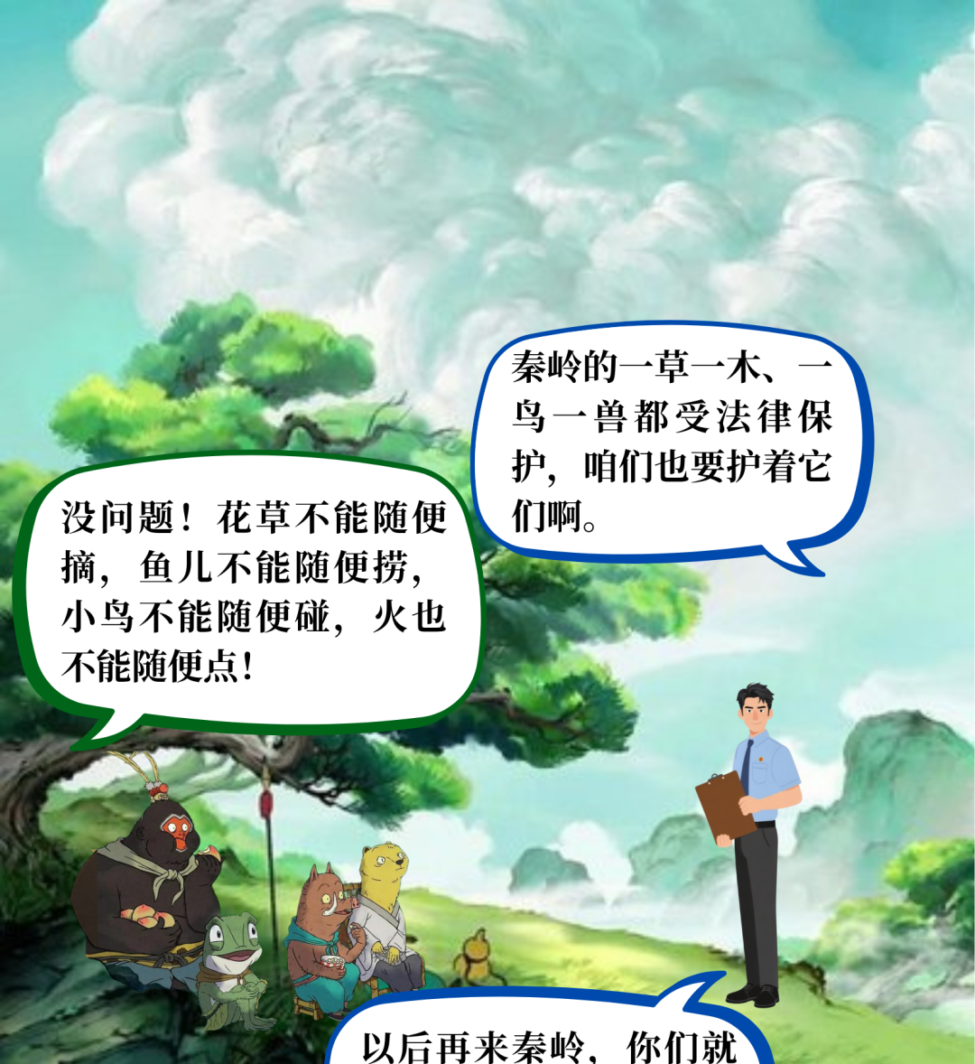 8月15日全国生态日,检察官邀请了浪浪山“草根取经团”的四个小妖怪,踏进了郁郁葱葱的秦岭,一场特别的研学之旅就这样开始了......