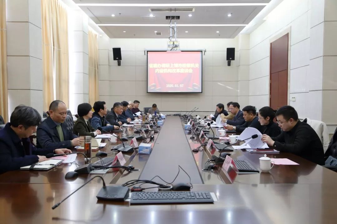 2020年1月7日上午,江西省委编办副主任陈卓飚一行调研组3人,在省检察院干部人事处副处长王露茜、市委编办主任毛哲军等陪同下来我院召开全市检察机关内设机构改革调研座谈会。上饶市检察院党组书记、检察长黄严宏等院班子成员以及部分基层院检察长参加调研座谈。黄严宏首先向省委编办调研组详细介绍了我院编制总体状况,提出了上饶市检察机关内设机构改革后在编制方面存在的主要问题和面临的突出困难,并提出了有关的意见建议。广信区检察院检察长严毅、横峰县检察院检察长张传志、鄱阳县检察院检察长姚弋敏,分别就本单位在编制方面遇到的问题以及意见建议进行了发言。