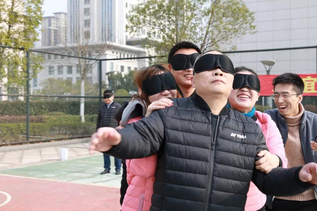 项目三 贪吃蛇:所有队员佩戴眼罩,只有蛇尾最后一名不戴眼罩。双手搭肩组成蛇头、蛇身、蛇尾,当蛇头摸到队友时,队友成为新的蛇头,依次循环,直到所有队友连成一条蛇。