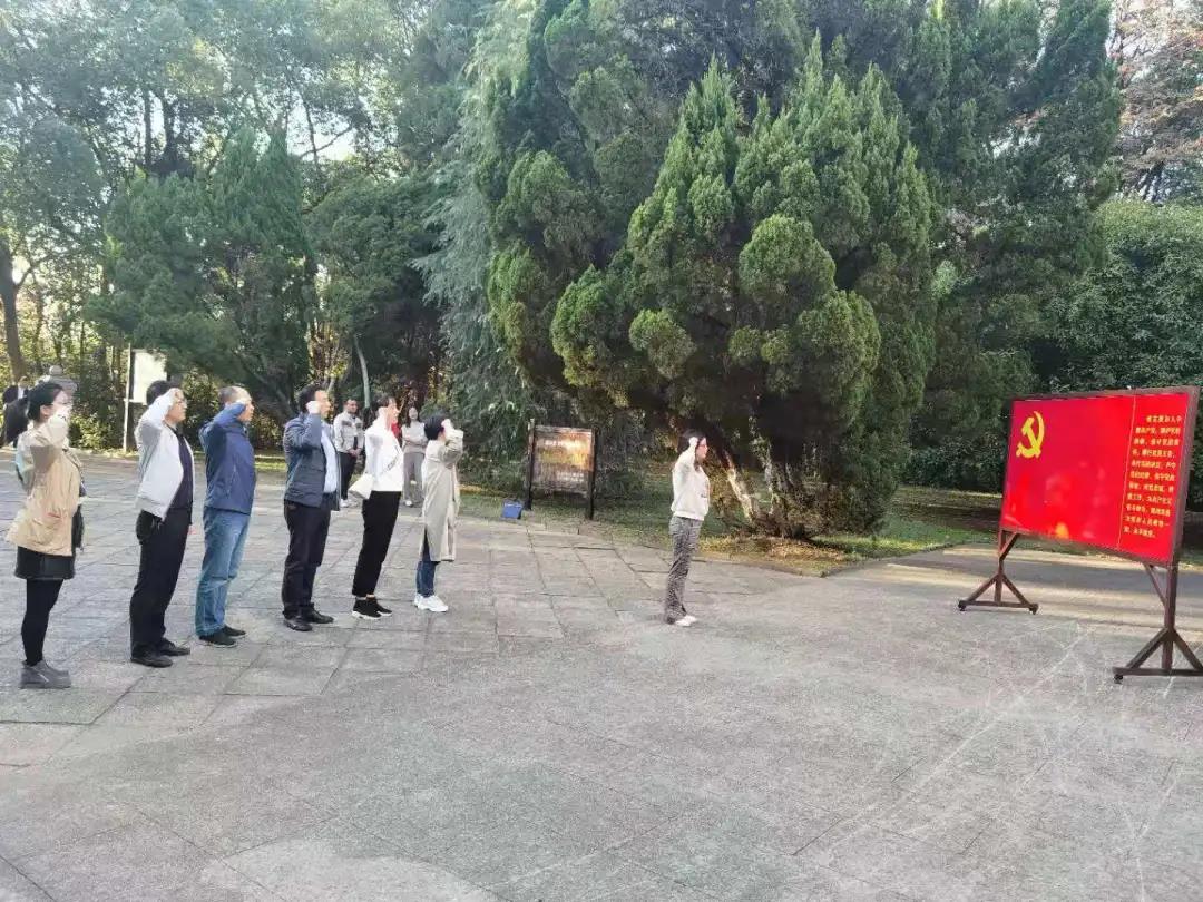 全体党员怀着崇敬的心情站在革命烈士纪念碑前,向革命烈士敬献花圈并三鞠躬。面对党旗,党员们高举右拳,在支部书记方金枝同志的带领下,重温入党誓词,找寻初心,激励使命。