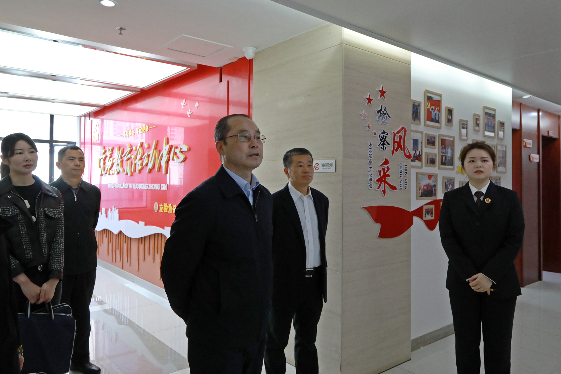 指导组一行先后到市检察院12309检察服务中心、检察业务专用区、案件管理大厅、党员教育活动中心实地调研指导工作。