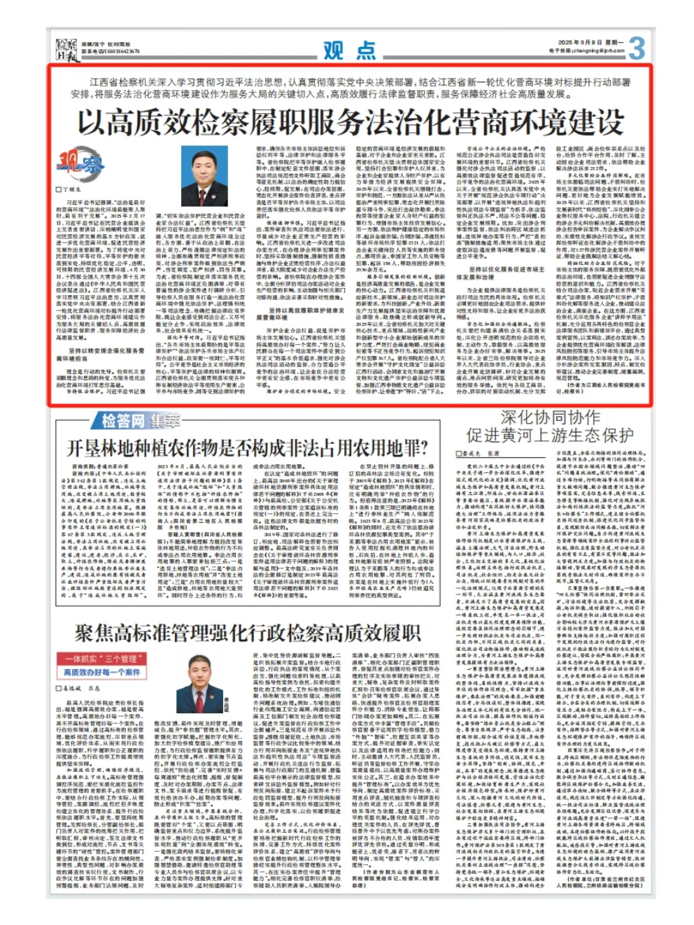 江西省检察机关深入学习贯彻习近平法治思想,认真贯彻落实党中央决策部署,结合江西省新一轮优化营商环境对标提升行动部署安排,将服务法治化营商环境建设作为服务大局的关键切入点,高质效履行法律监督职责,服务保障经济社会高质量发展。