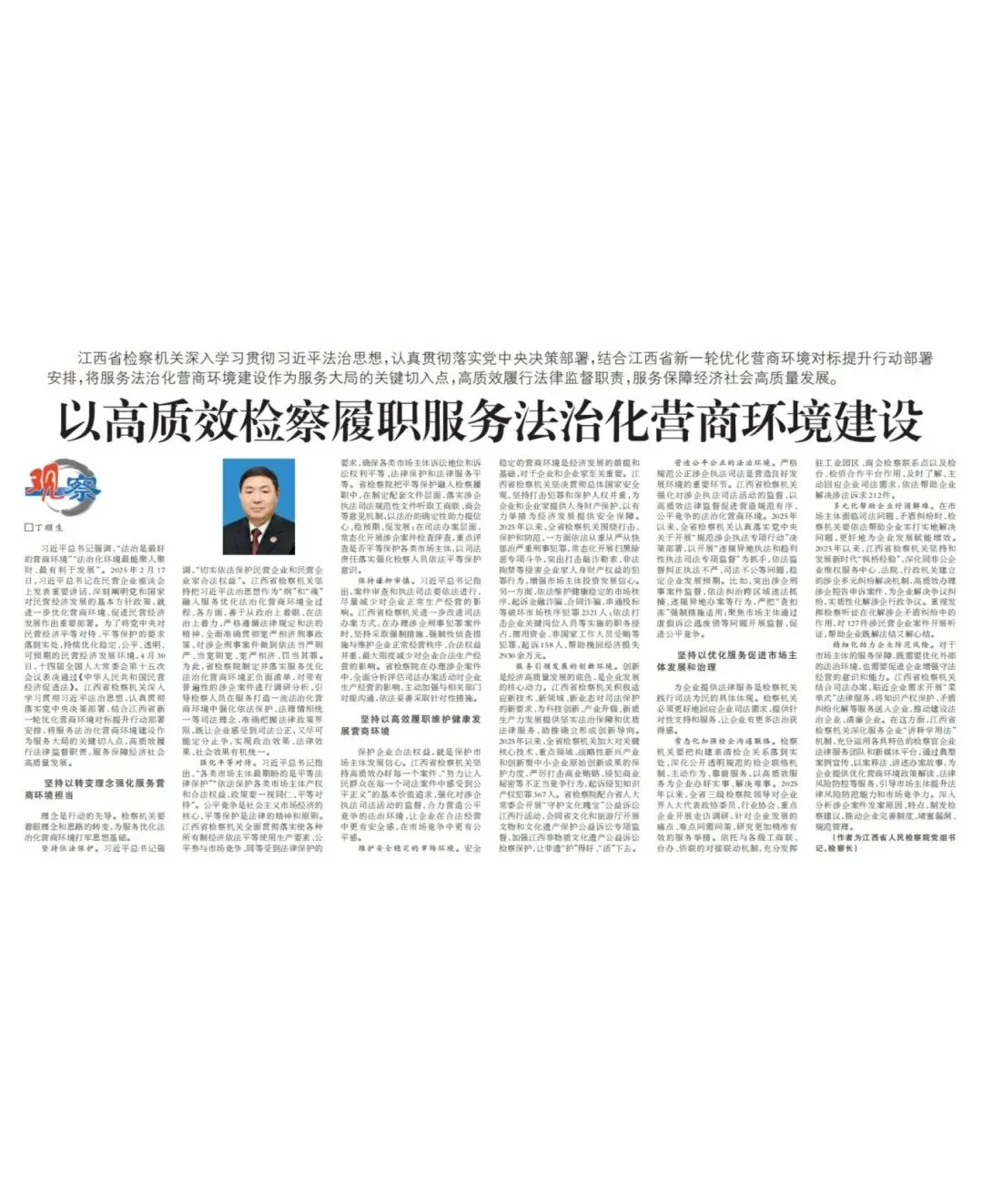 习近平总书记强调,“法治是最好的营商环境”“法治化环境最能聚人聚财、最有利于发展”。2025年2月17日,习近平总书记在民营企业座谈会上发表重要讲话,深刻阐明党和国家对民营经济发展的基本方针政策,就进一步优化营商环境、促进民营经济发展作出重要部署。为了将党中央对民营经济平等对待、平等保护的要求落到实处,持续优化稳定、公平、透明、可预期的民营经济发展环境,4月30日,十四届全国人大常委会第十五次会议表决通过《中华人民共和国民营经济促进法》。江西省检察机关深入学习贯彻习近平法治思想,认真贯彻落实党中央决策部署,结合江西省新一轮优化营商环境对标提升行动部署安排,将服务法治化营商环境建设作为服务大局的关键切入点,高质效履行法律监督职责,服务保障经济社会高质量发展。