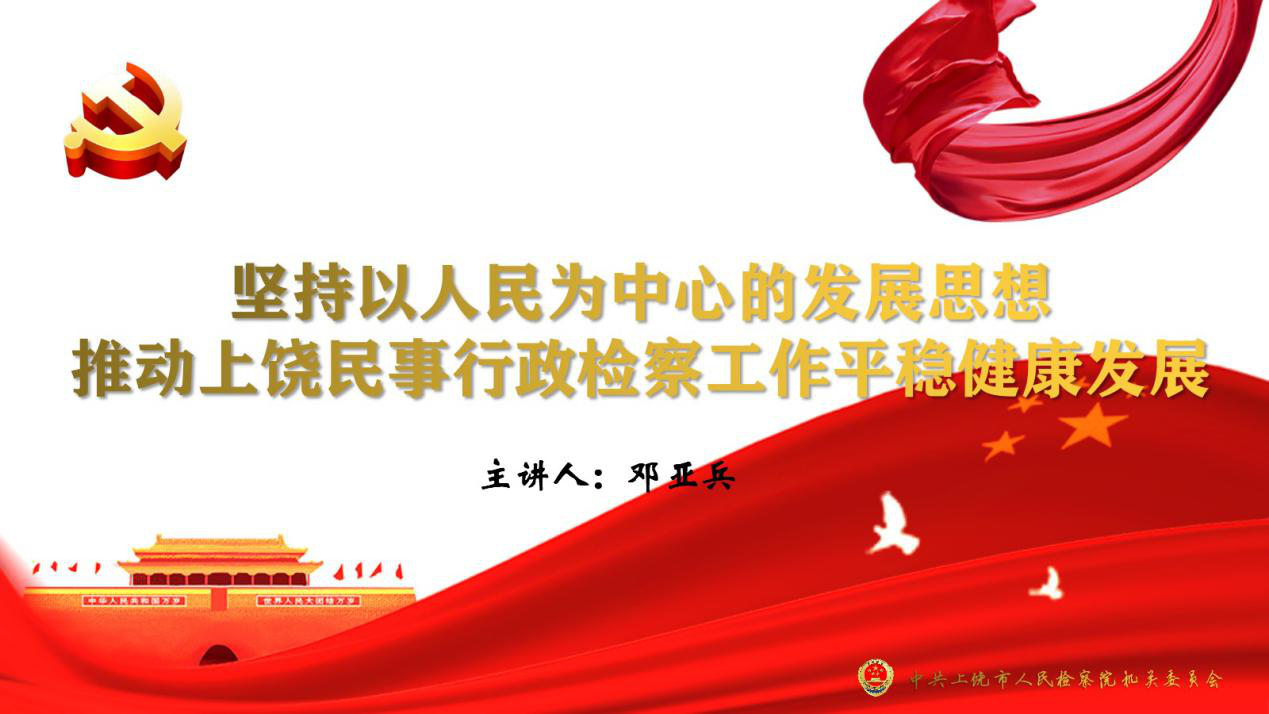 邓亚兵同志结合民事行政检察工作实际,围绕“坚持以人民为中心的发展思想,推动上饶民事行政检察工作平稳健康发展”为主题,从学习习近平同志“以人民为中心”发展思想的学习体会、坚持以人民为中心是民事行政检察工作的灵魂和生命、当前民事行政检察工作存在的突出问题与下一步努力方向等三个方面进行了阐述。他表示,只有坚持以人民为中心的发展思想,只有将人民装在心中,时时处处件件为人民群众着想,工作起来就有方向,人就有使命担当、就会忠诚履职尽责,就会积极主动作为,就可以把民事行政检察工作做好,从而实现“让人民群众在每一个司法案件中都感受到公平正义”这一目标。